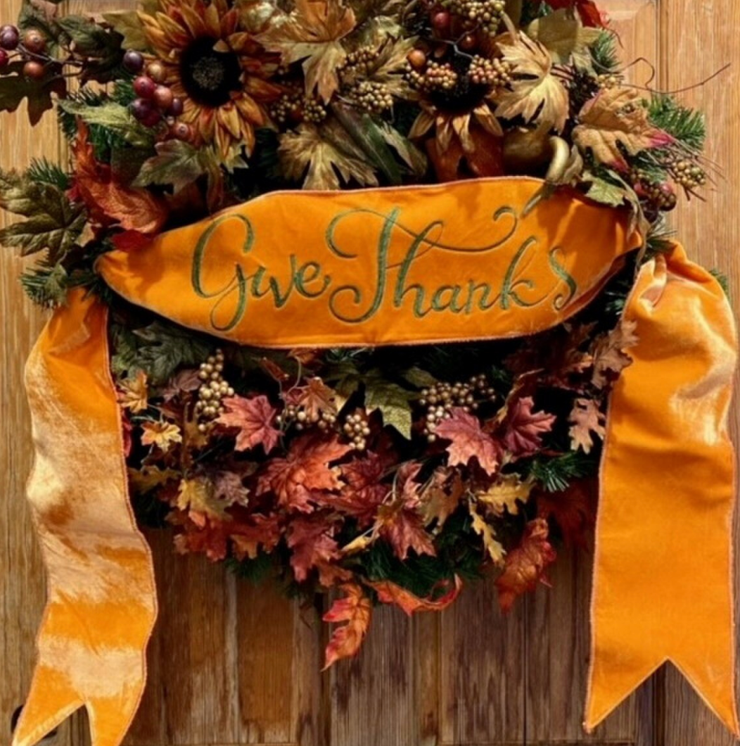 Description: 6"x 70" velvet embroidery "Give Thanks" banner, orange
