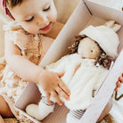 Bundled in her own Glad Dreams coat and bunny-ears hat, little Elsie is ready for many delightful adventures. This soft doll is perfectly outfitted in a pink & grey dotted frock, bloomers, and fur-trimmed booties to complete her outfit. Presented in a timeless keepsake wardrobe box with "Over the hill and by the bay to Grandma's house I'll go. Bundled in my Glad Dreams Coat. Oh, how the wind does blow!" written on the inside.