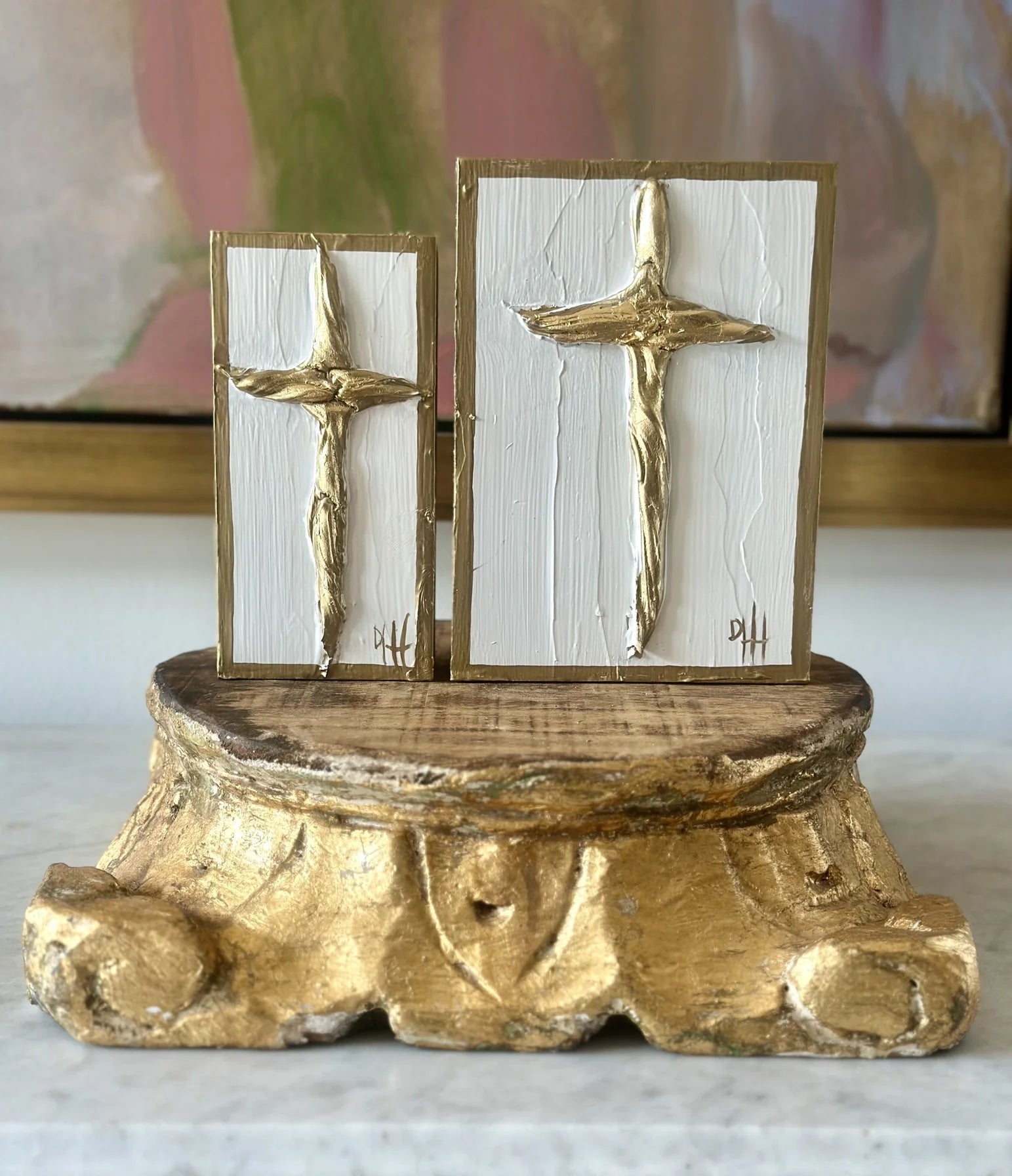 The Gold-Leaf Cross stems from Christ's sacrifice and how that changes eternity for those who put their faith in Him! Each piece incorporates texture with gold leaf, white acrylic paint, my signature, and the inscription of one of my favorite verses on the back of the artist wood panel.