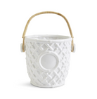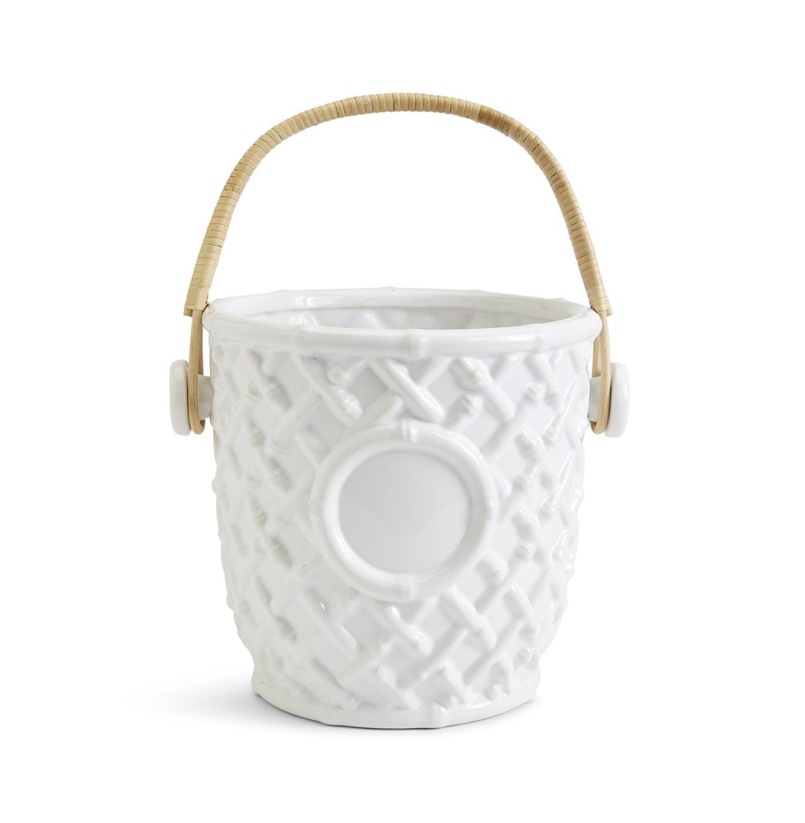 A modern take on the classic Chinoiserie style. This white faux bamboo Champagne/Wine bucket will look chic in almost any home. Made from ceramic and accented with a natural bamboo handle that makes it easy to carry.