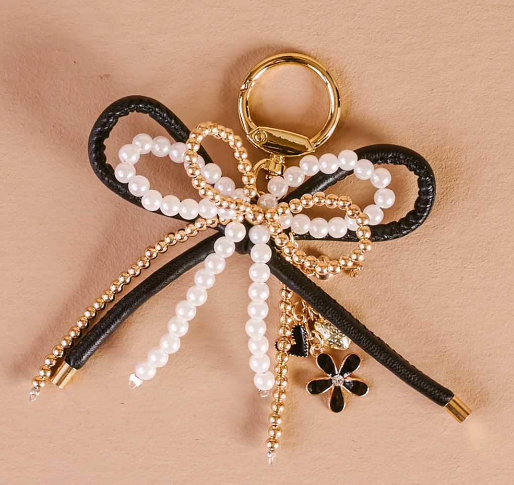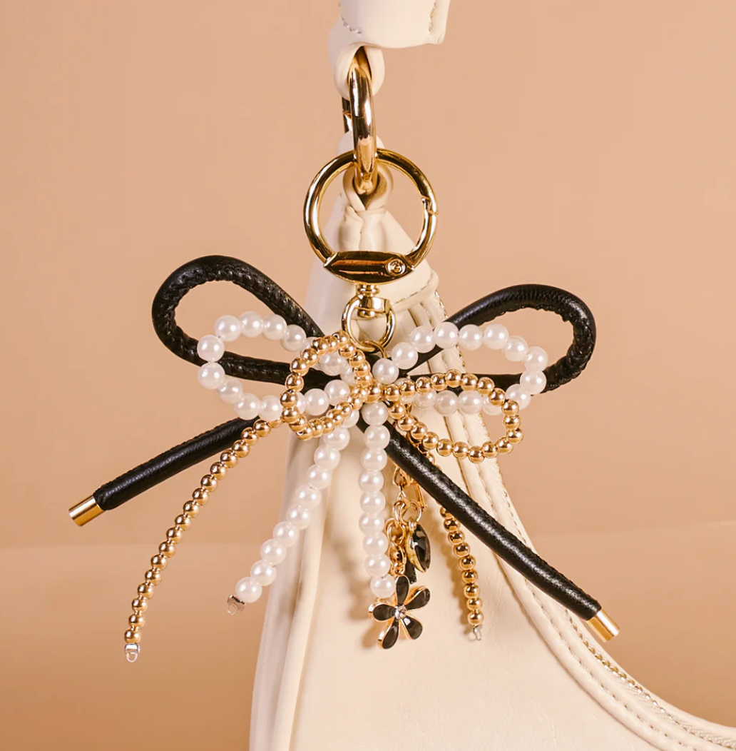 Elevate your everyday with our Layered Bows Bag Charm—a luxe little accessory stacked with style. Featuring a trio of bows in faux leather, pearls, and gold beading, this charm brings dimension and glamour to any bag. Finished with a delicate drop chain and coordinating mini charms, plus a gold clip for easy attachment, it’s the perfect mix of sweet, chic, and statement-making.