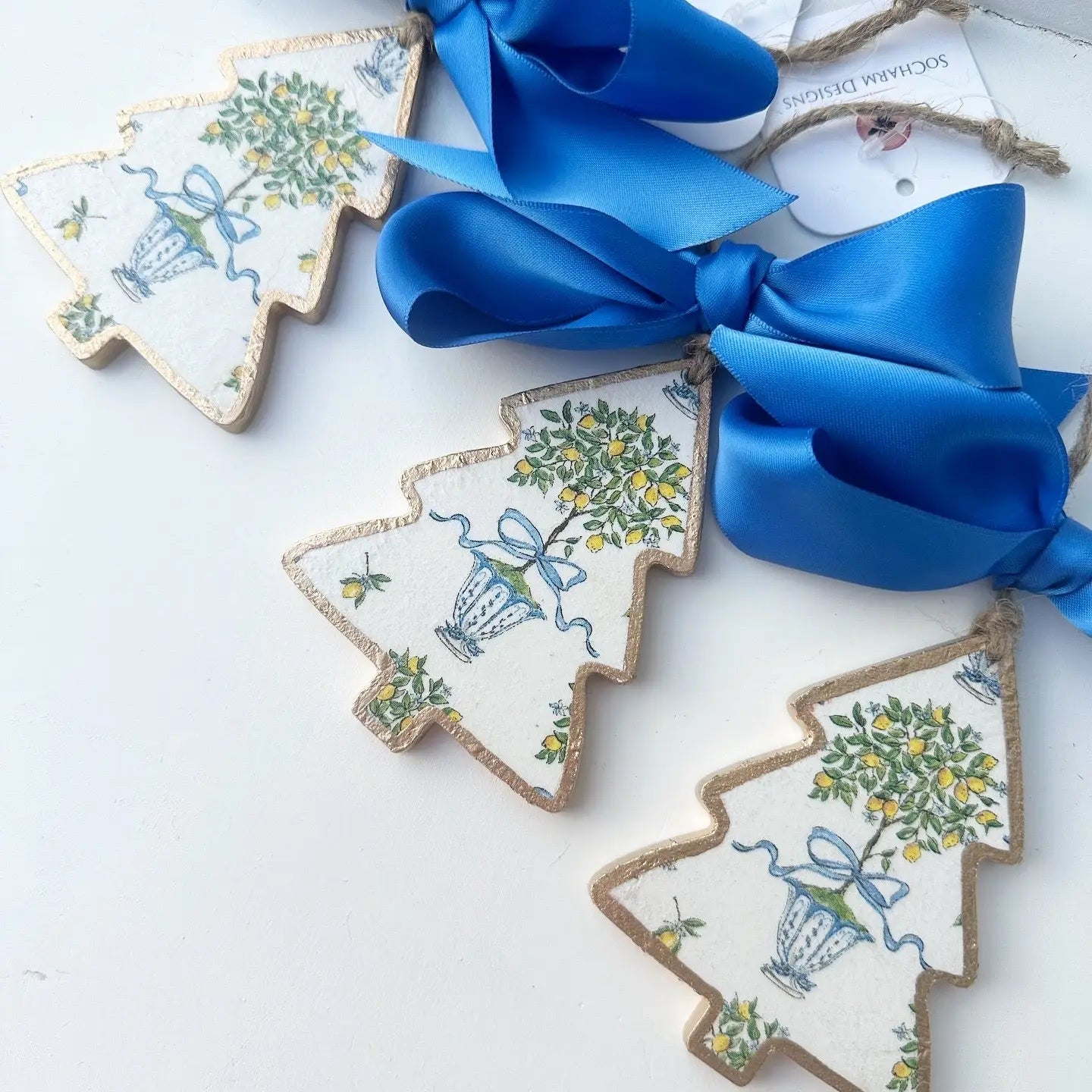 These handmade ornaments are meticulously hand decoupaged and painted and finished with a satin bow. The edges are painted in a high quality gold paint and all ornaments are sealed for protection.