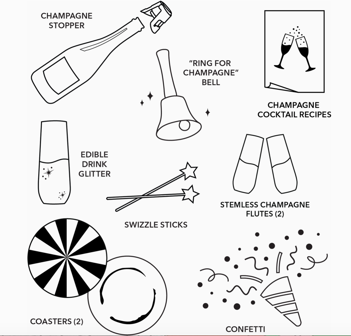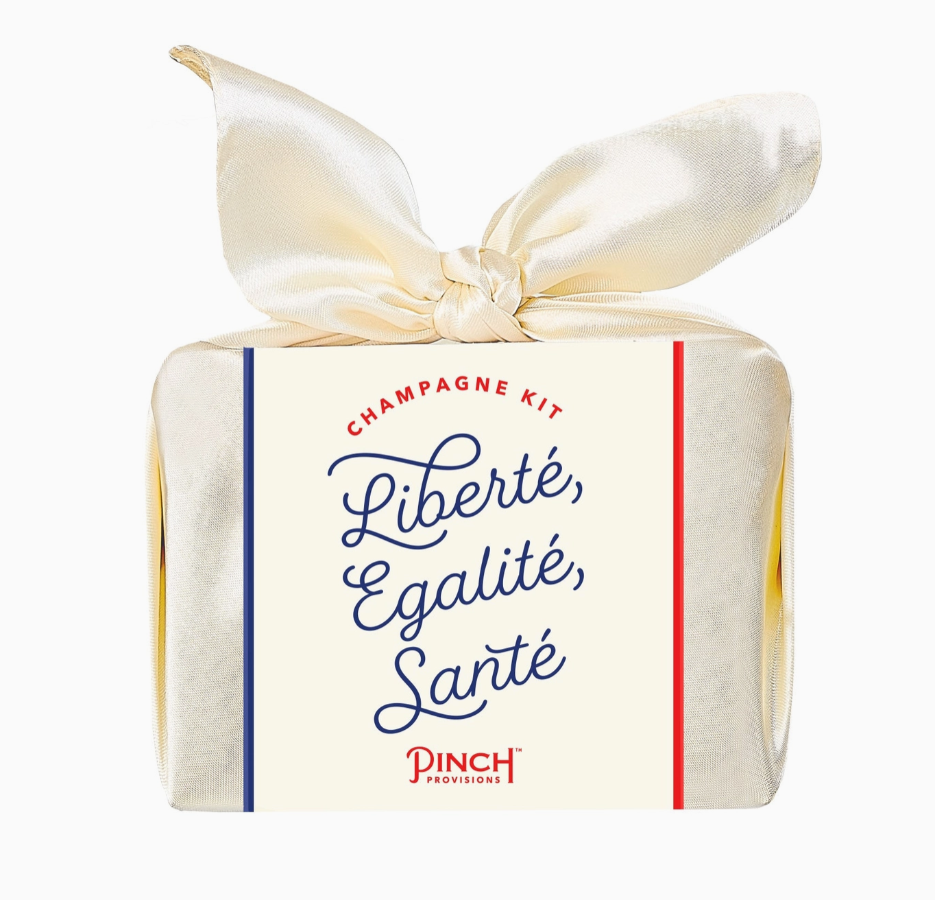 Raise a glass with this French-inspired Champagne Kit. Sante! This delightful assortment of effervescent essentials is ready to gift in a Furoshiki-style bow box. You'll be raising a glass to these 11 must-haves during a night in or 4th of July fireworks. Inside includes 2 mini stemless champagne flutes, a champagne bottle stopper, confetti, coasters (2), swizzle sticks (2), edible gold glitter, a champagne cocktail recipe card, and a "ring for champagne" bell. Just add the champagne!