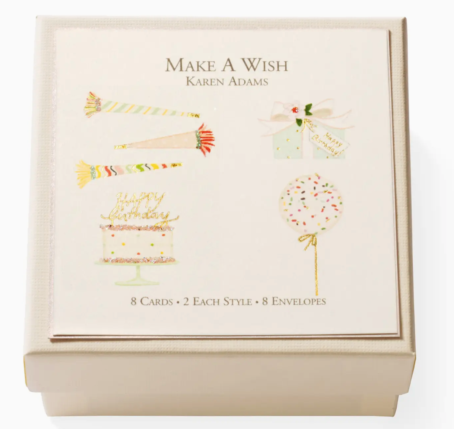 Paper color | natural white. Envelope color | vellum. Print process | full color. Embellishment | hand-glittered. Dimensions | 3 x 3 inches. Quantity | 8 cards + 8 envelopes.