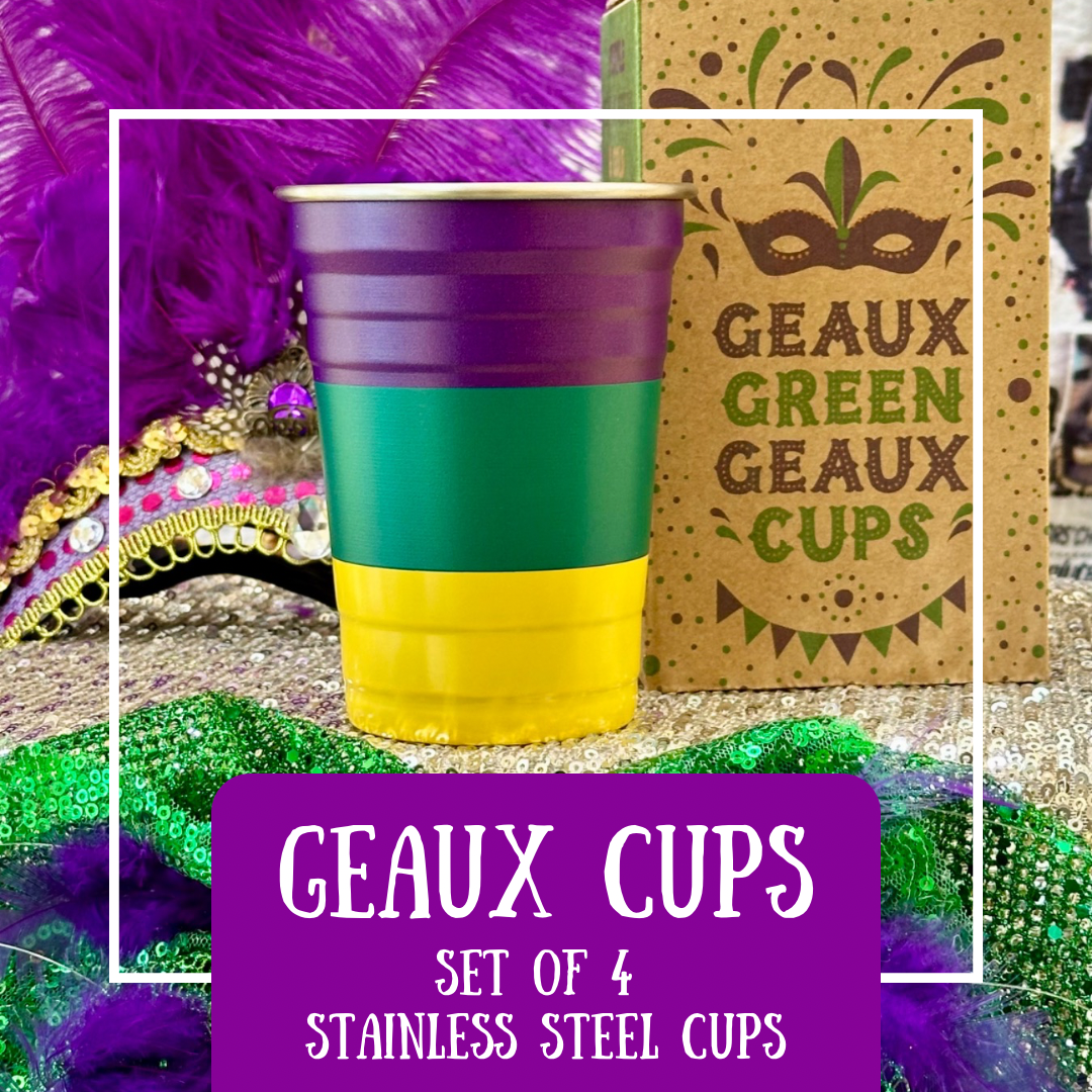 Introducing GEAUX GREEN GEAUX CUPS, four 16 oz stainless steel cups crafted for Mardi Gras and beyond! Adorned with a classic Mardi Gras design, these cups keep your drinks icy cold during the festivities. Not just drinkware, but souvenirs! They're the perfect keepsake from your Mardi Gras experience. Join the celebration sustainably with GEAUX GREEN GEAUX CUPS, a stylish, eco-friendly, and delightful way to keep your drinks cool!