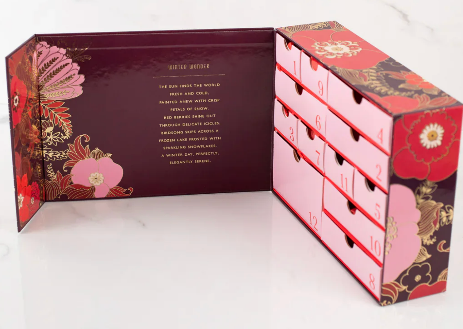 This exquisite set is truly a collector’s item. Embossed with enchanting flowers gilded in gold, filled with impeccably beautiful detail, and finished with a picture-perfect bow. Soak in the magic & wonder as you slide open elegant drawers to reveal each irresistible tissue-wrapped surprise.