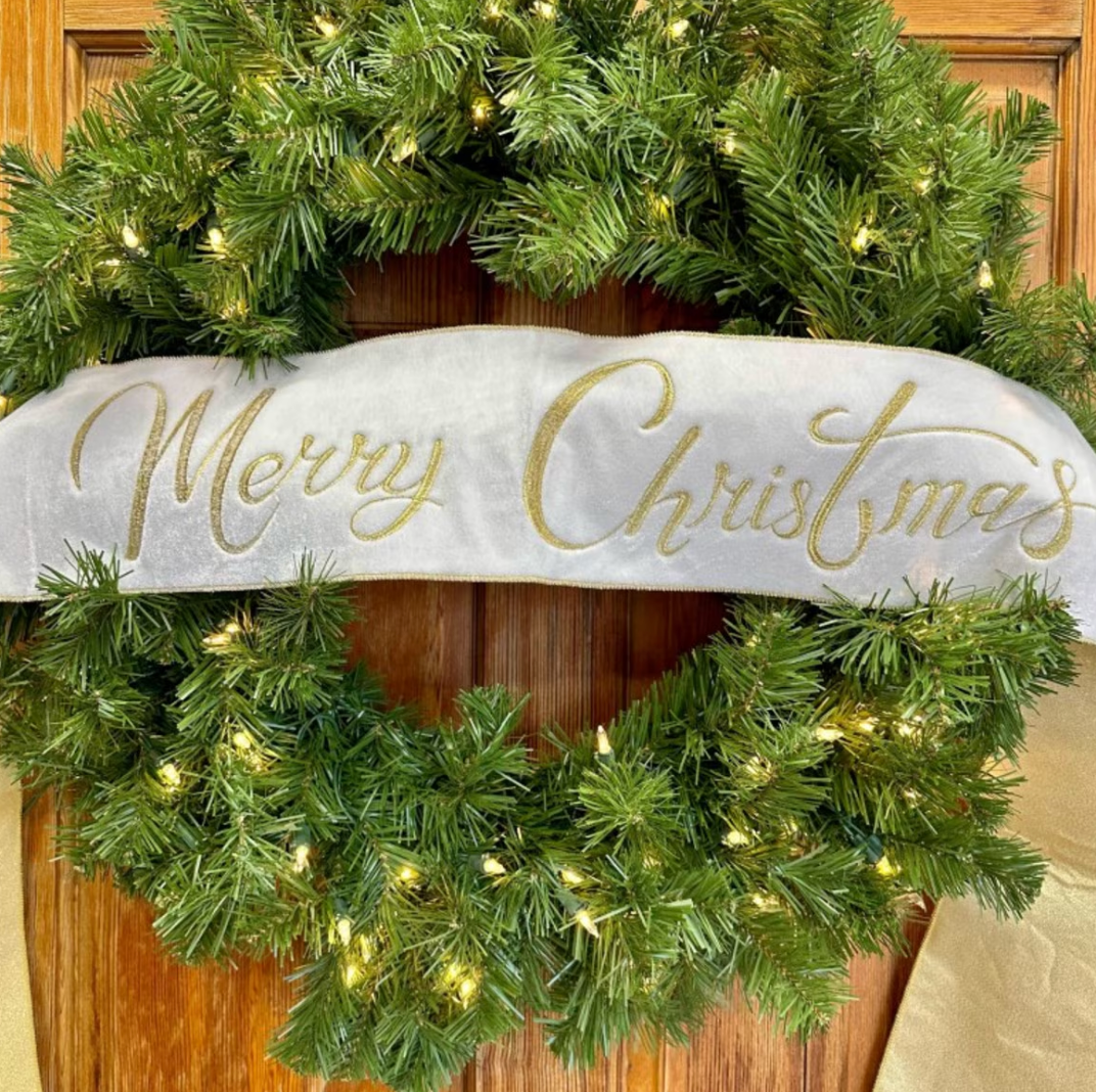 Description: 6" x 70" velvet wired banner gold embroidery Merry Christmas, winter white