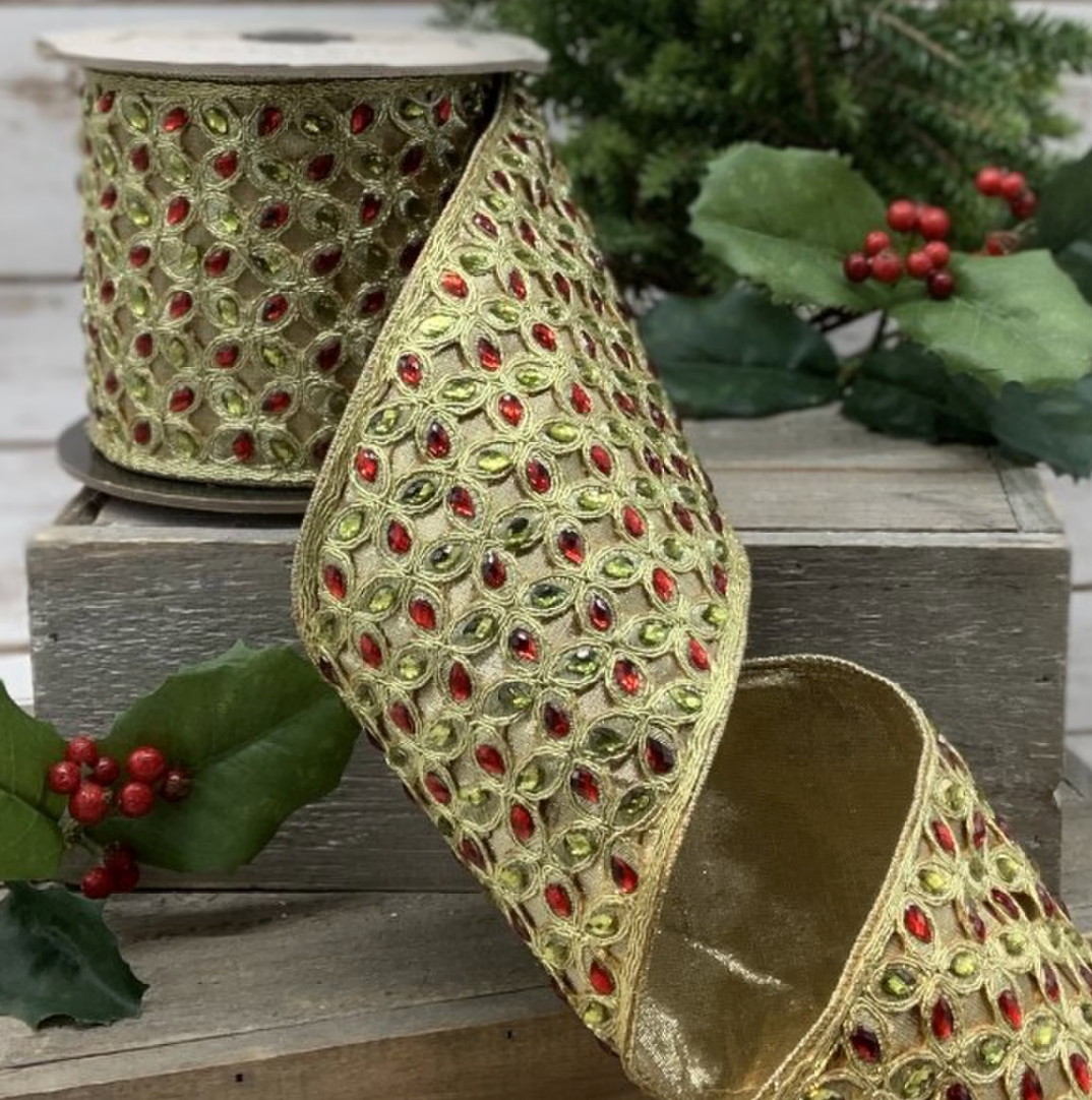 Description: 4" x 5yds faux metallic dupion filigree jeweled trim, green-red