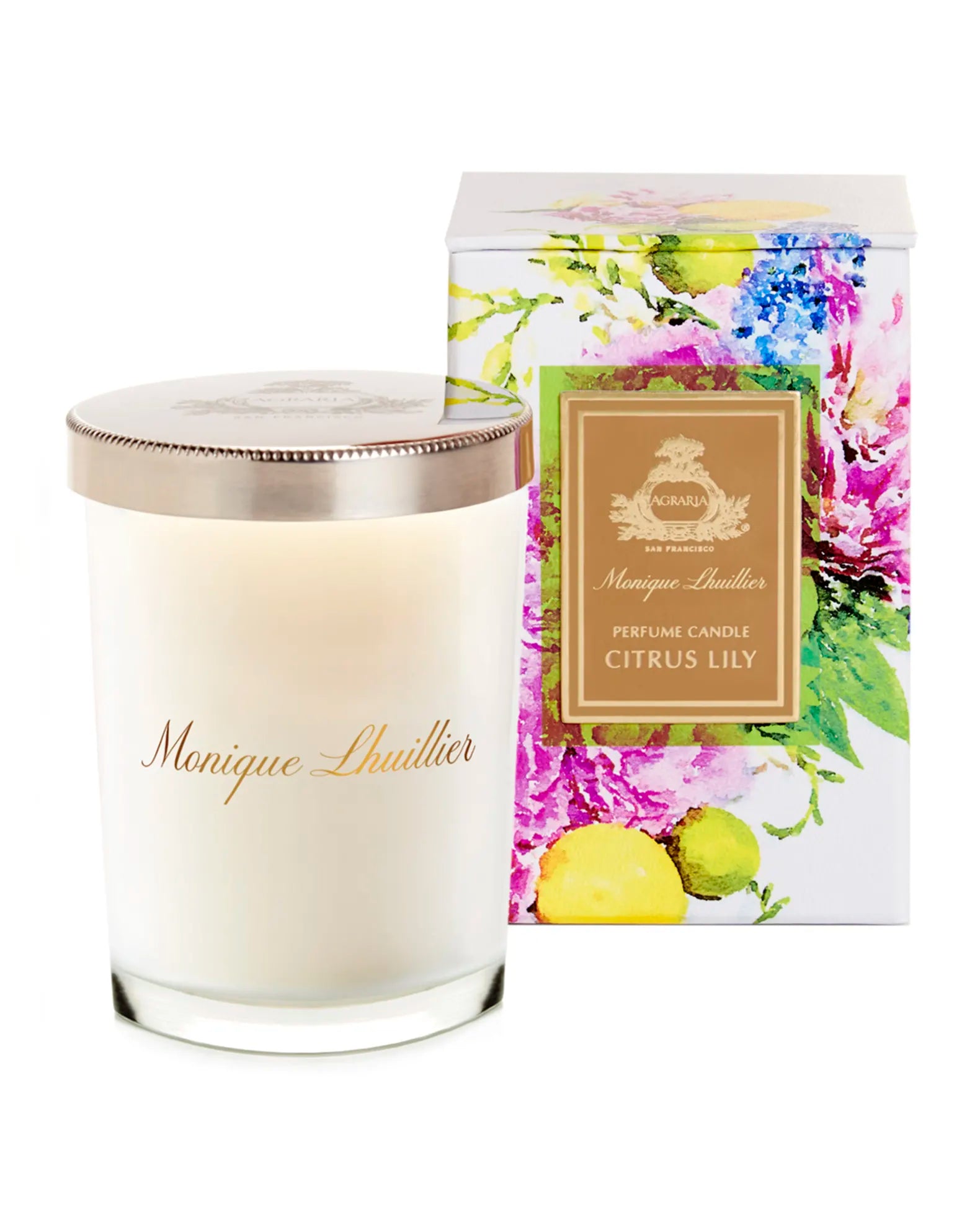 Agraria's Perfume Candle is presented in a uniquely frosted decorative glass that is distinctly Monique Lhuillier.