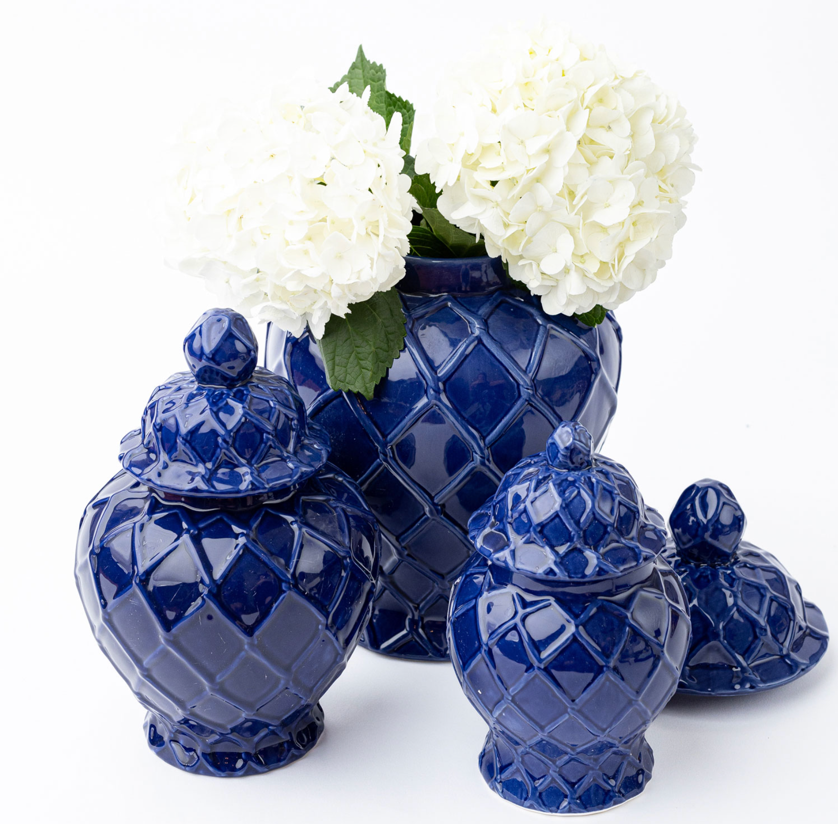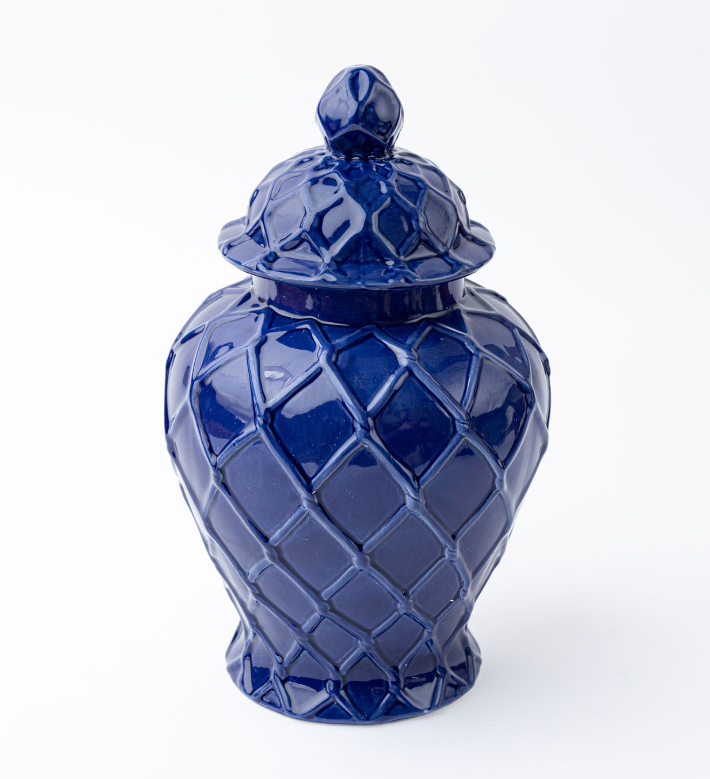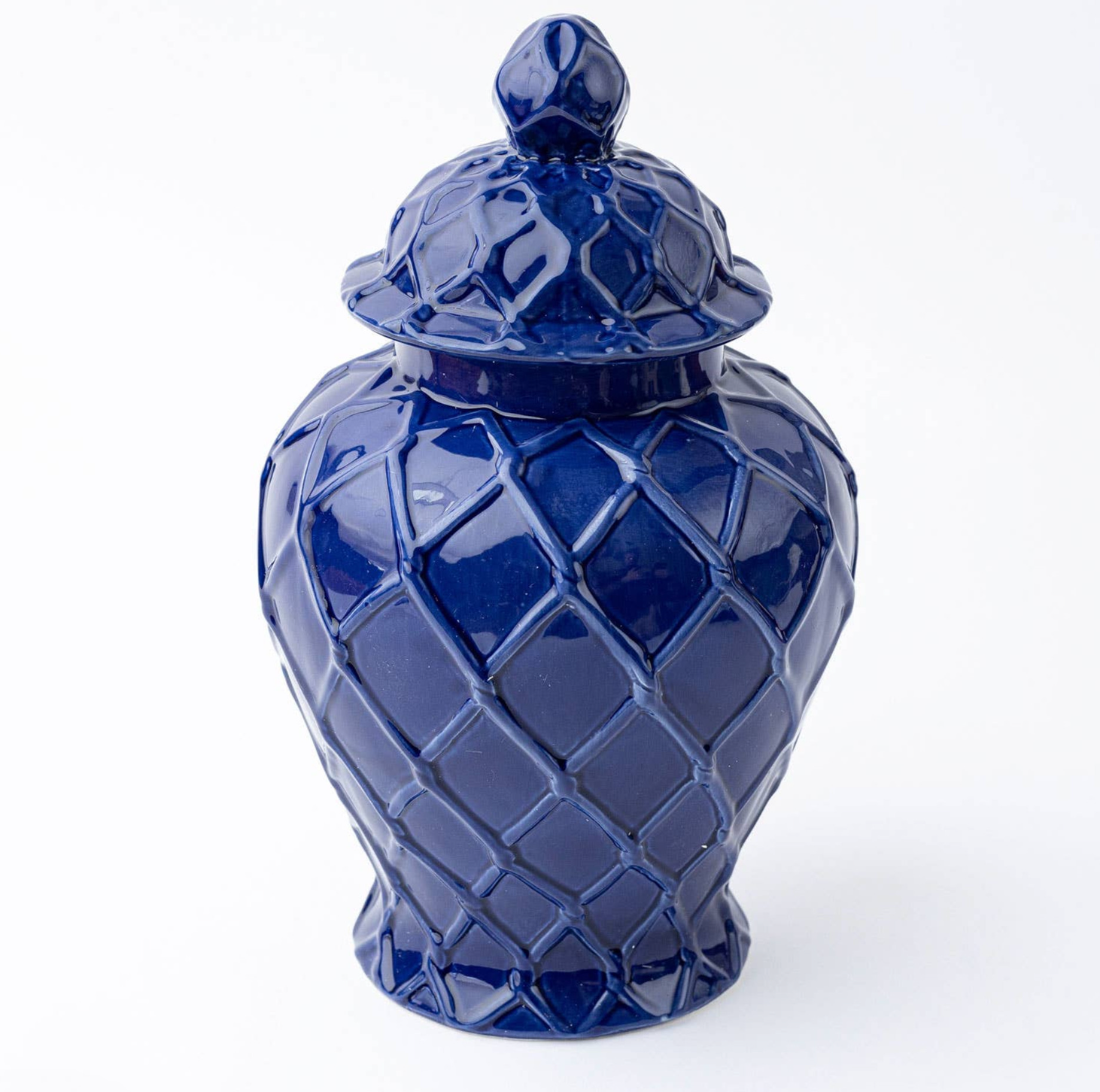 Capture timeless elegance with the beautiful Navy Textured Ginger Jar! This exquisite jar features an intricate, textured pattern, and removable lid. Display as a standalone item or pair with similar pieces, no matter how you display it you'll add a subtle sense of style to any room. Don't forget the matching collection! For a perfectly uniform look opt for the large & extra-large jars or mix & match with our other colors for an interesting, layered look.