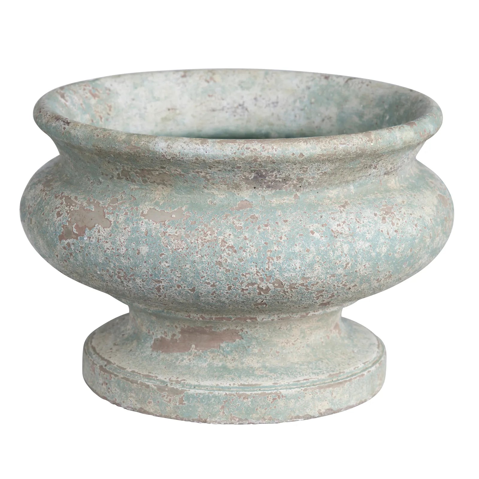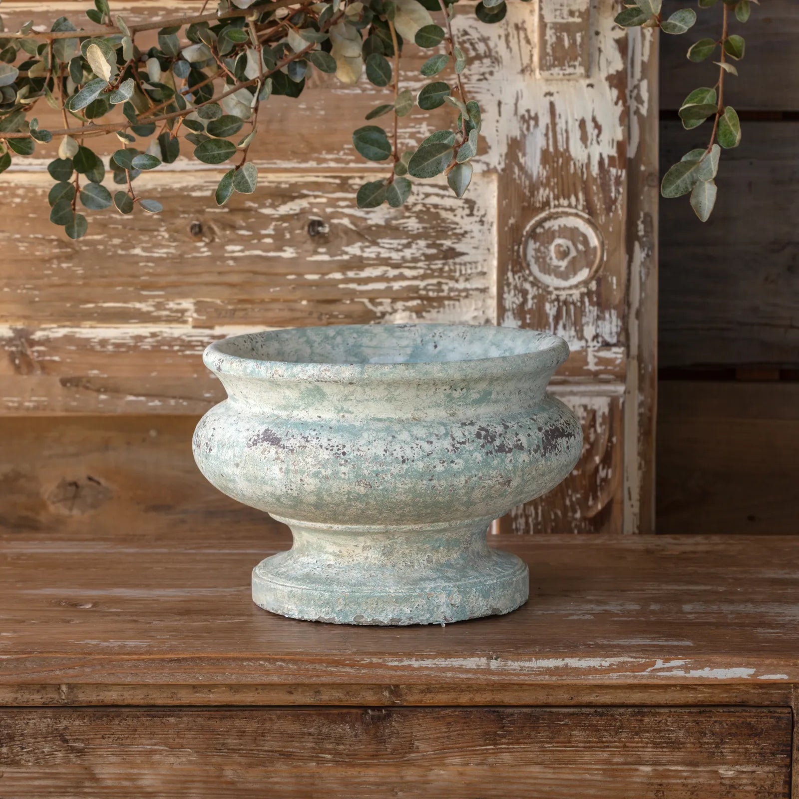 Our new pottery, Orleans collection, has a pale blue green weathered finish. The Orleans Footed Low Urn Large is a great size for larger potted plants and florals.