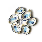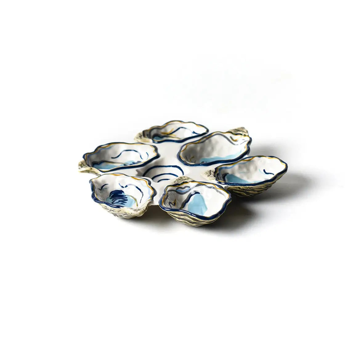 Transport your dining experience to the bay with the Oyster Half Dozen Platter. This serving piece is specially made to hold six oysters, and it includes a bowl in the middle for your favorite garnish. This platter can also be used to host chips and vegetables at summer parties. This unique design is sure to be the talk of the party! Every Coton Colors piece comes to life through the work of our design team in Tallahassee, Florida. We artfully design our products from start to finish to inspire you to never miss an opportunity to celebrate every day. This ceramic platter (9.5in L x 9.3in W) is dishwasher safe; not microwave safe (due to metallic feature).