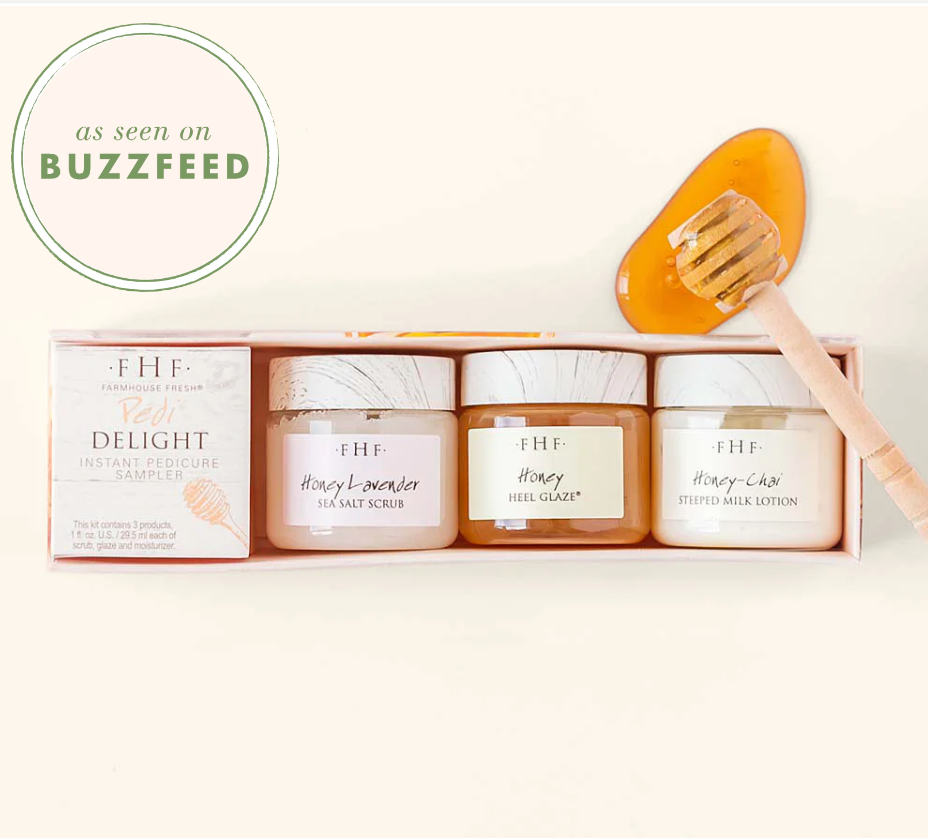 Includes our best-selling Honey Heel Glaze® (Oprah's O-List foot serum made with date honey), lightweight Honey Lavender Sea Salt Scrub, and Honey-Chai Steeped Milk Lotion® (a gorgeous, spiced-milk infusion of organic coconut milk and sultry cardamom).