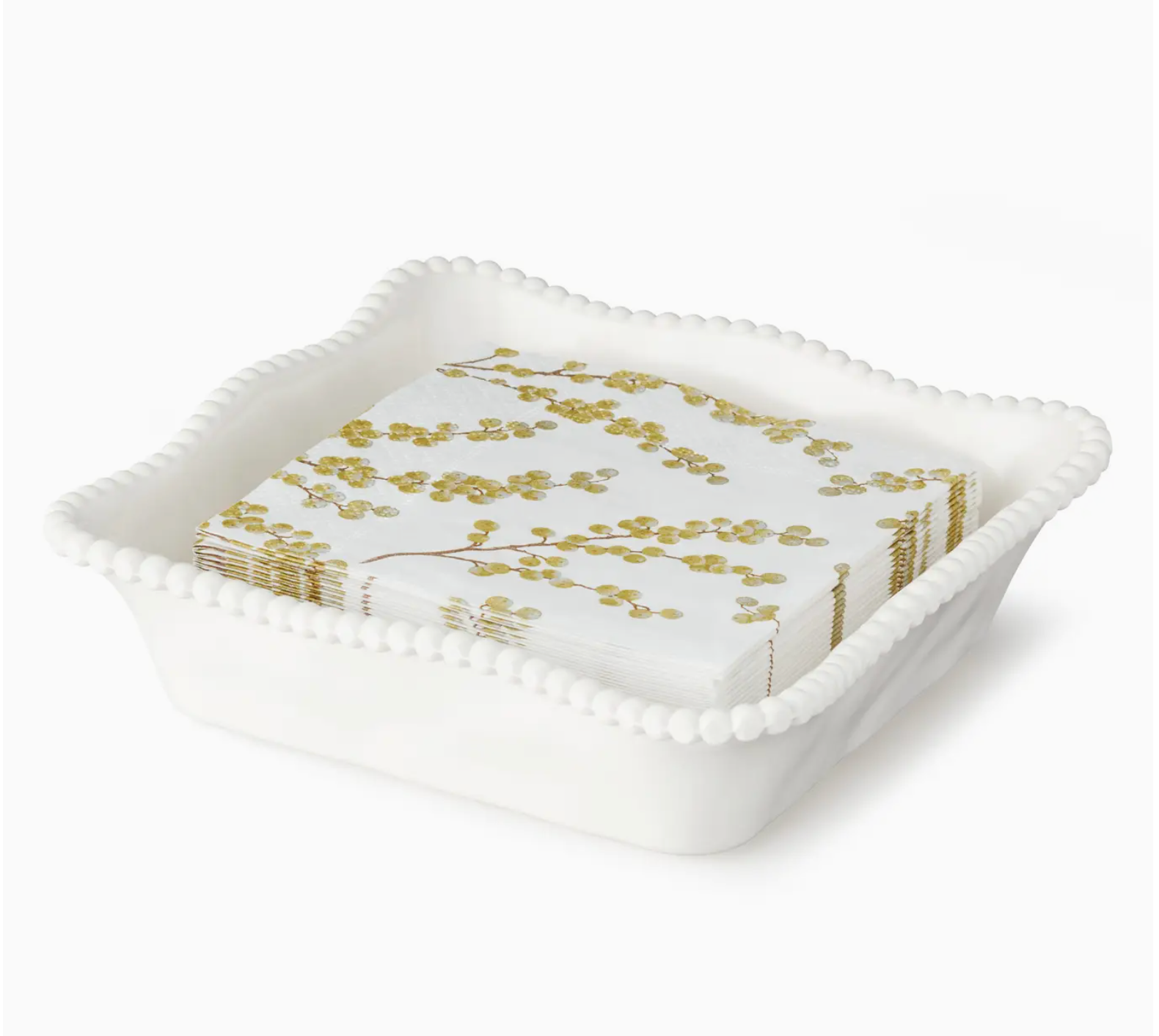 Host with elegance and charm using the Perlette Cream Cocktail Napkin Holder. Designed with a refined scalloped edge and intricate pearl-like bead detailing, this 7 x 7 x 2.25-inch holder beautifully complements any cocktail or party setting. Perfectly sized for standard cocktail napkins, it keeps your napkins organized and within easy reach. Crafted from durable, high-quality materials, this holder adds sophistication to your gatherings while ensuring long-lasting use. Ideal for entertaining, casual gatherings, or even everyday display, this piece is a stylish essential for any host.