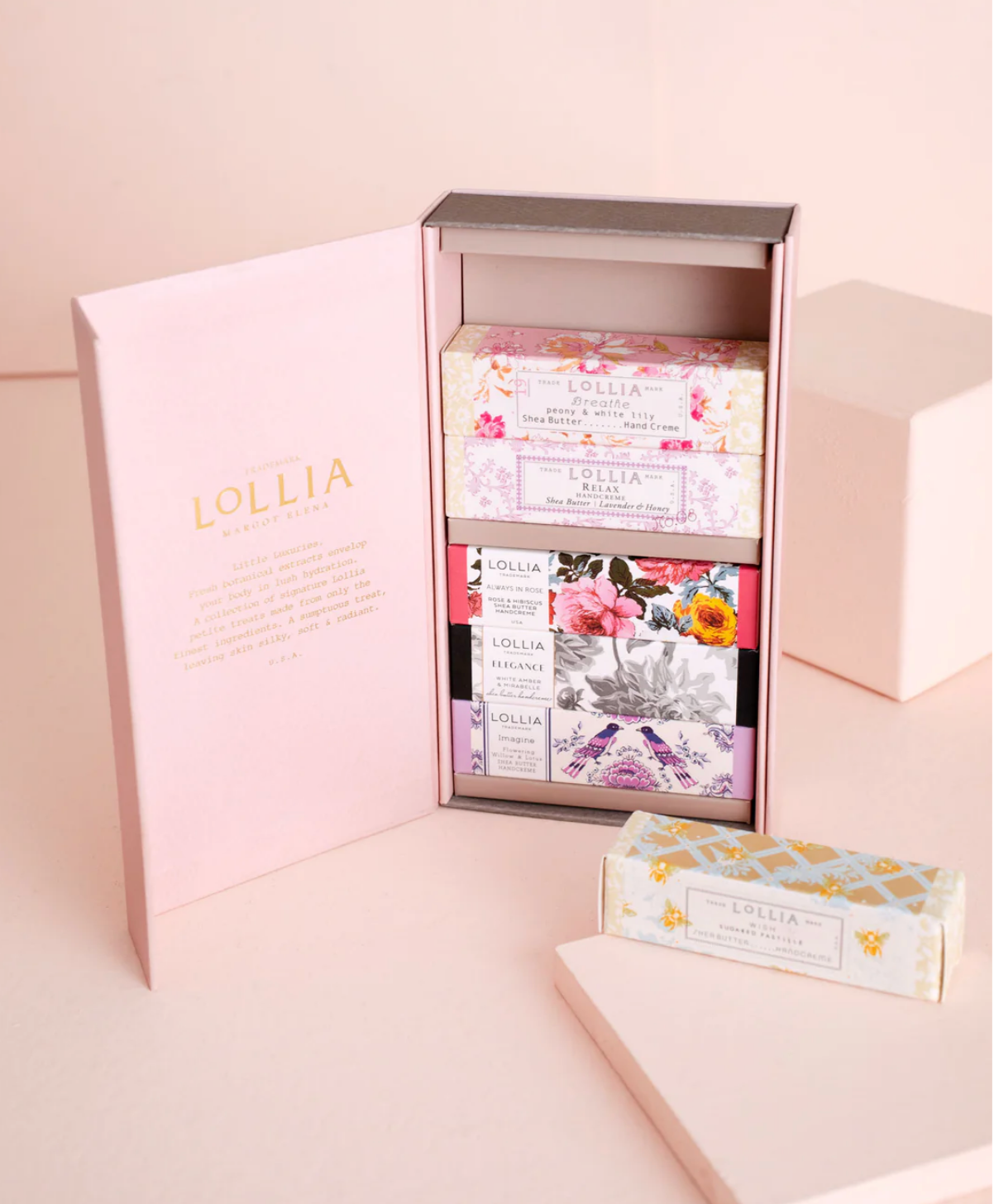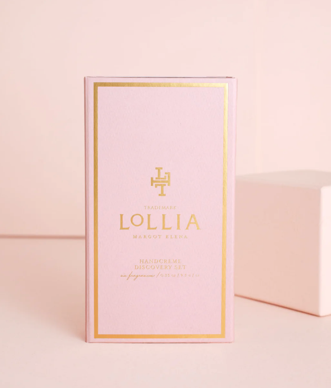 Nestled in a beautiful gold-kissed box, each miniature handcreme showcases an iconic Lollia pattern.