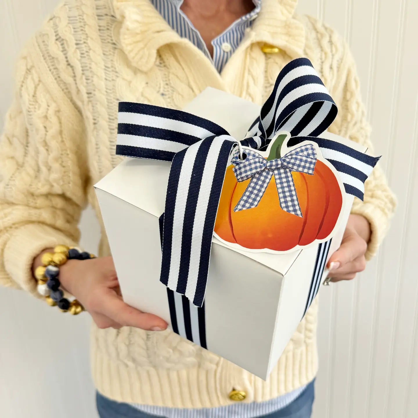 Our stunning NEW! die-cut gift tags are a must-have for Fall and Halloween. Our oversized pumpkin gift tag is perfect for tying onto gifts this holiday season! Printed on a 110# white cardstock, there is a hole drilled at the top and a white back for writing a note. A set of 8 gift tags + white grosgrain ribbon is packaged in a clear box. 4”x4”