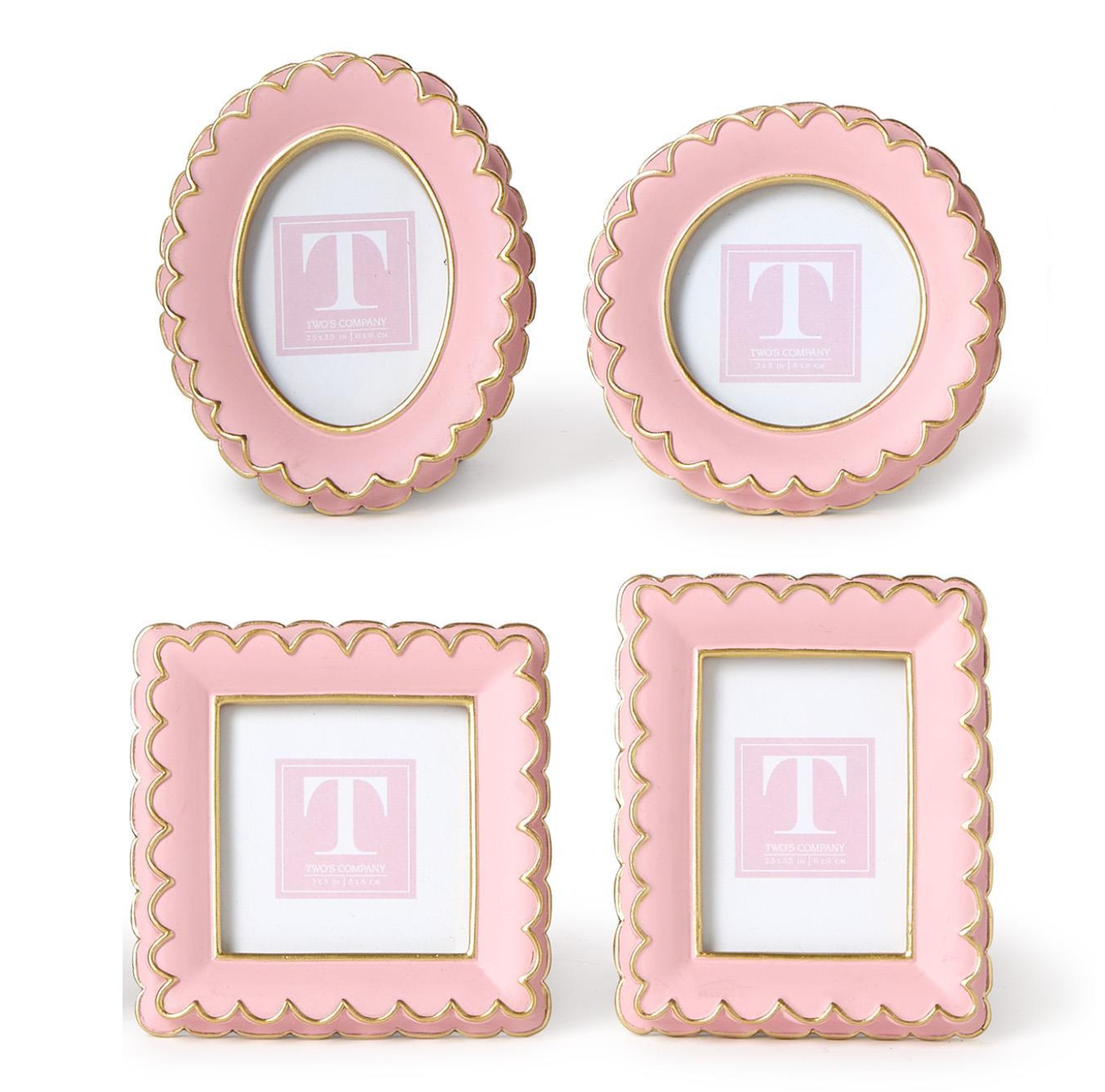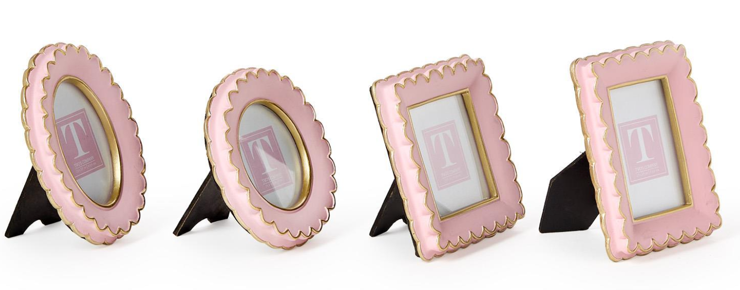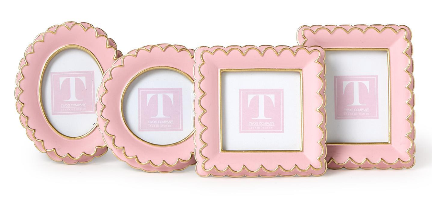 Create a charming vignette in your home with our Pink Scalloped Mini Photo Frames. These delicate frames come in four unique styles - round, oval, rectangle, and square - adding a touch of elegance to any space. Handcrafted from resin, these frames are as durable as they are beautiful, showcasing your cherished memories with style.