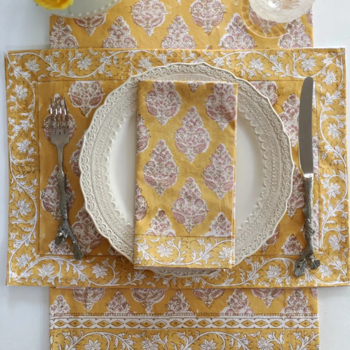 This Castile Mustard placemat is block printed in a mellow mustard color with accents of blush pink in the buti flower. These placemats will be a staple in your table linen arsenal. Used alone, or layered over a tablecloth, placemats add versatility to any table.