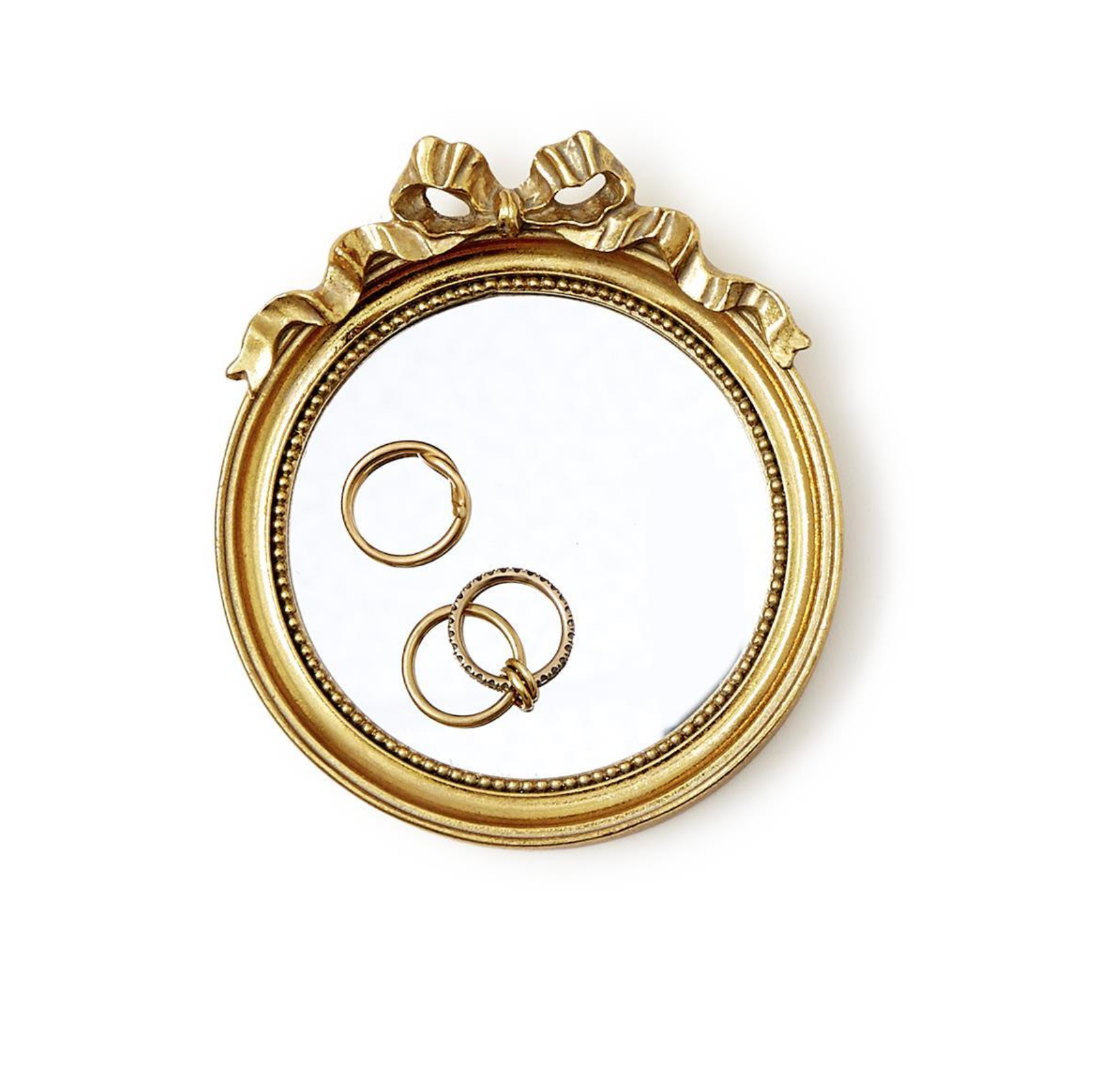 Elevate your vanity or dresser with the charming Round Mirror Trinket Tray. This delightful piece, crafted from resin and glass, features a delicate accent bow that adds a touch of elegance to any space. Perfect for storing your favorite jewelry or small trinkets, this tray is as functional as it is beautiful. Handcrafted with care, this trinket tray is a must-have for those who appreciate the finer things in life.
