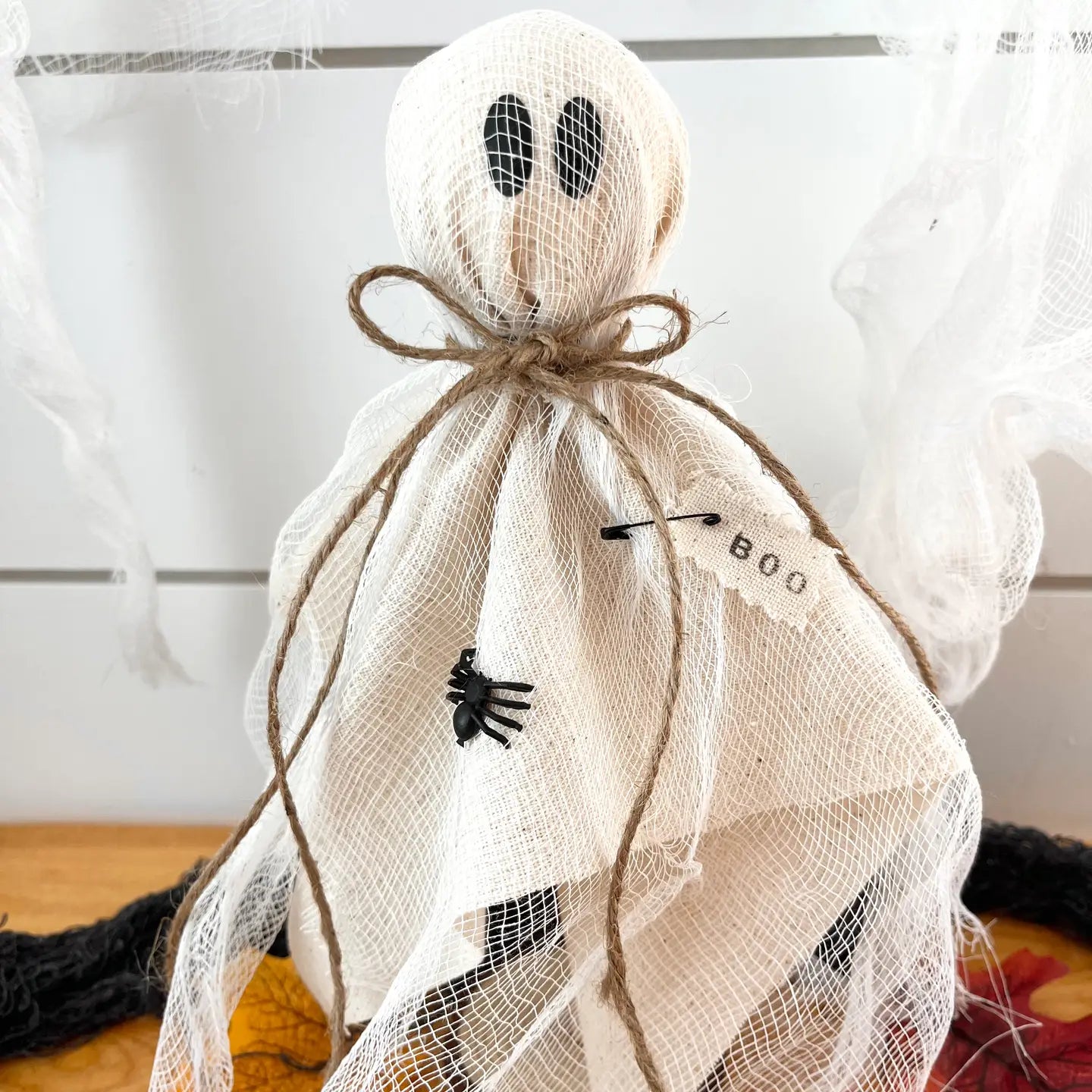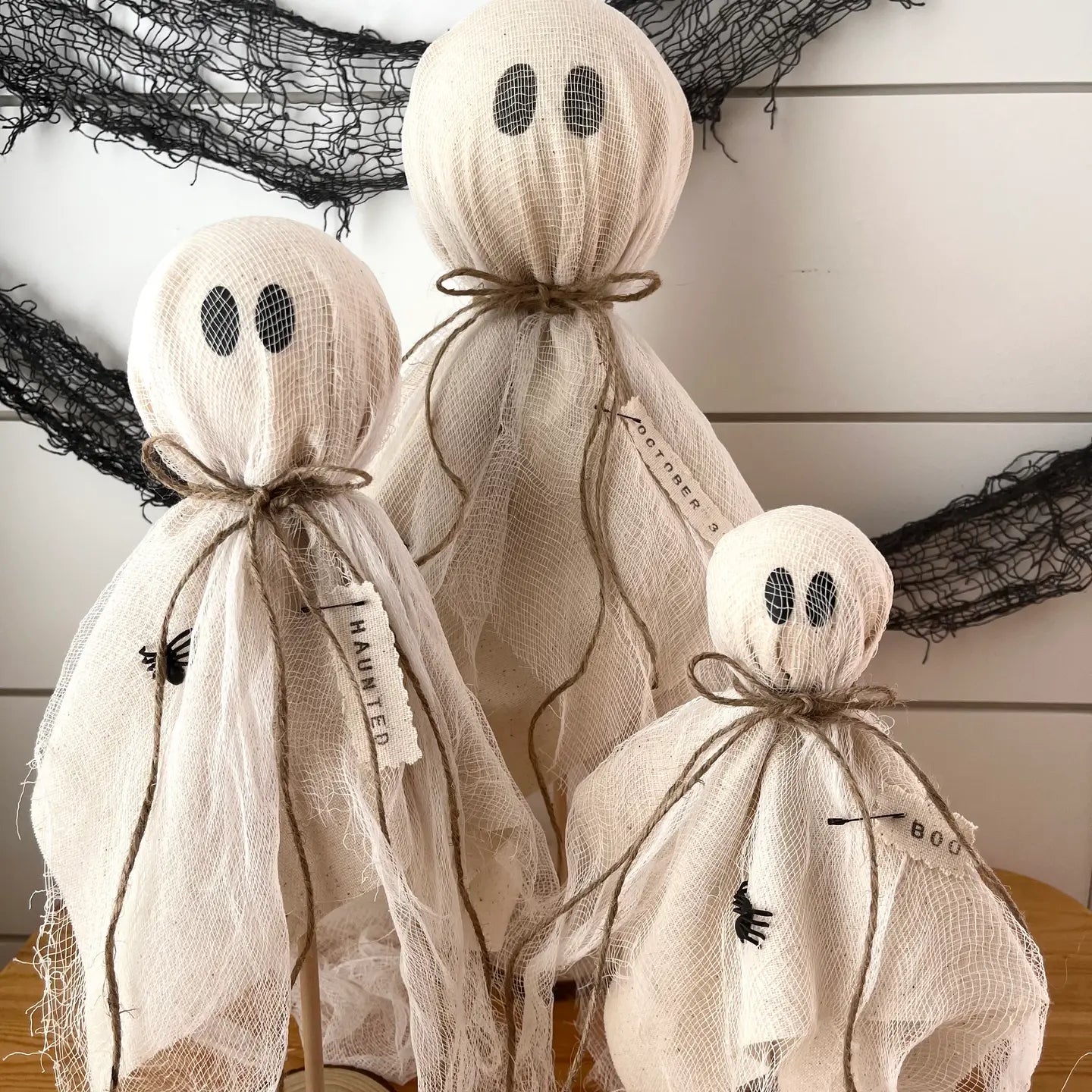 Our whimsical primitive ghosts are sure to be a customer favorite. Perfect for tiered trays, farmhouse hutches and Halloween displays. Available in three sizes. x-Large Approx: 16" tall x 8" wide Large Approx: 12" tall x 7" wide Small Approx: 9" tall x 6" wide Each is on a natural 2"-3" wood circle base, x-large is a 3" base or larger. Layers may be fluffed for a more full look or left as is for a more simple look. Cheese cloth is layered over natural cotton for a dimensional look to our ghost. The x-Large ghost has a longer drape than the smaller sizes for more styling options. Other home decor shown not included.
