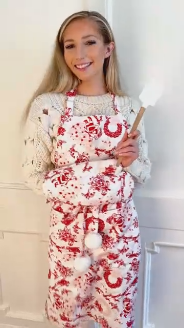 Get cooking with the beautiful Santa Toile Pom-Pom Apron! Perfect for the everyday cook, its 100% cotton fabric protects your clothes from spills or splatters, while the adjustable neck strap makes it the ideal fit for all sizes. This apron also comes equipped with a spacious front pocket to free up your hands in the kitchen, making baking easier than ever before. Plus, with its machine washable material you can enjoy unparalleled convenience as you create delicious meals day after day. Whether you’re an experienced chef or just starting out, let our Classic Nutcracker Apron lead your culinary journey with an elegant appeal! Don't forget to get the matching Children's apron for your little bakers! 36" x 27" x .25" 100% Cotton Machine Wash Cold, Gentle Cycle Tumble Dry Low. Do Not Dry Clean. Do Not Iron Designed in the USA; Imported