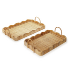 Elevate your space with the timeless charm of Scalloped Edge Trays with Handles. Crafted from rattan each tray boasts a unique hand-crafted origin, showcasing natural imperfections that add character and warmth to your decor. The set includes two sizes, perfect for styling together or separately in your living room, bedroom, or kitchen. Whether displayed on a coffee table with candles and books or used to serve drinks to guests, these trays effortlessly blend style and functionality.