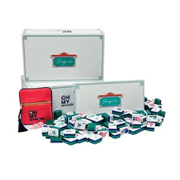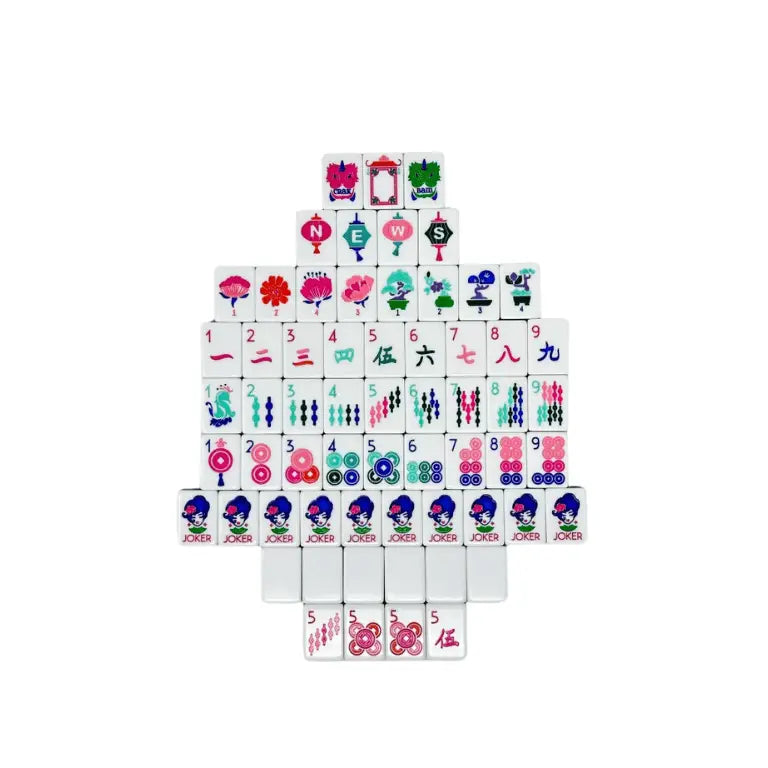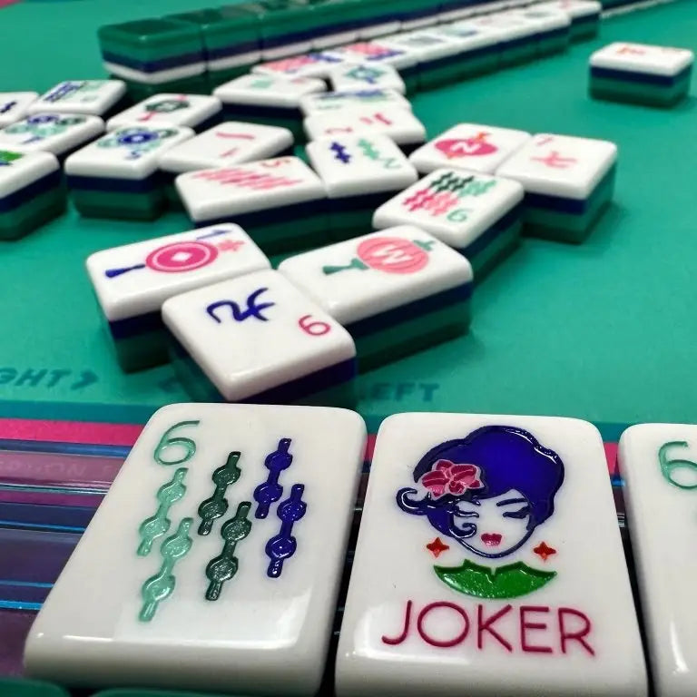 Where tradition meets vibrant colors! These Mahjong tiles are meticulously designed and hand-painted, blending classic elements with a modern twist. Featuring stripes in emerald green, light emerald, and royal blue, each tile boasts unique images that add a touch of elegance to your game. But what truly sets this set apart is our favorite character, the Joker Lola. Representing the ultimate woman matriarch and boss, Lola embodies strength and power. She adds a special flair to every game. These tiles are suitable for various Mahjong games, such as Babcock, Chinese, and Riichi Mahjong. Additionally, there are four extra 5's included, which should be removed if playing American Mahjong. Set includes Tiles, Dice/Coin Bag and 4 Instructional Cards (If playing American Mahjong, will need to purchase NMJL Playing Card separate) Tiles: - 164 Acrylic Tiles - 1-9 Bams, Cracks and Dots (4 of each) = 108 - N E W S (4 of each) = 16 - Red, Green and White Dragon (4 of each) = 12 - Flowers = 8