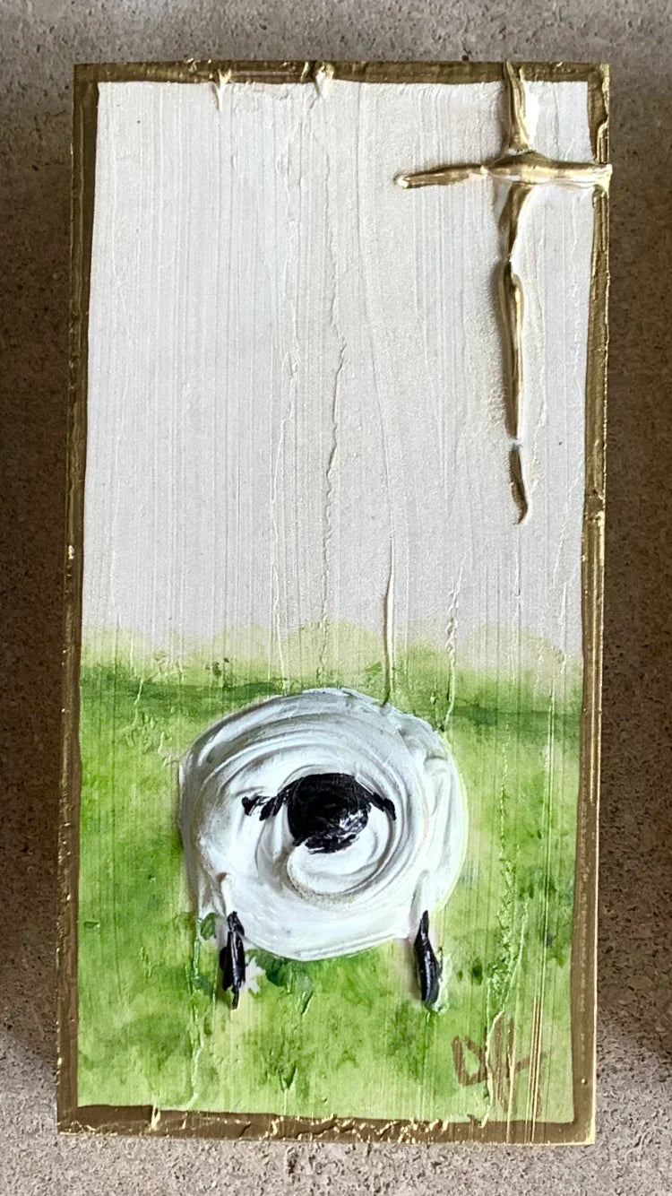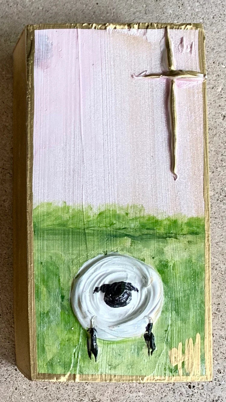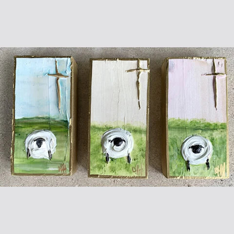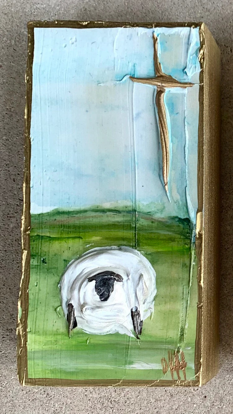 The Sheep Block features a sheep, a gold-leafed cross in the corner, my signature, and my inspiration for the collection, John 10:27, inscribed on the back of the artist wood panel. Available in pink, blue, or champagne. 3" x 6" x 1 5/8"