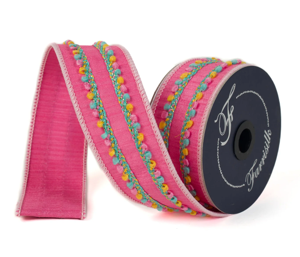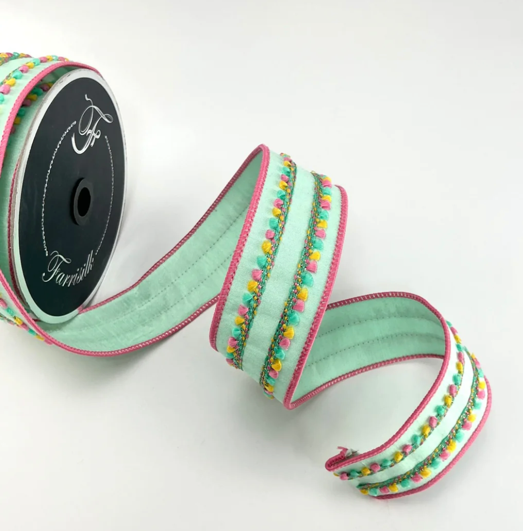 Ribbon is constructed with thick, wired edge and backed with a secondary fabric to provide shape and structure.