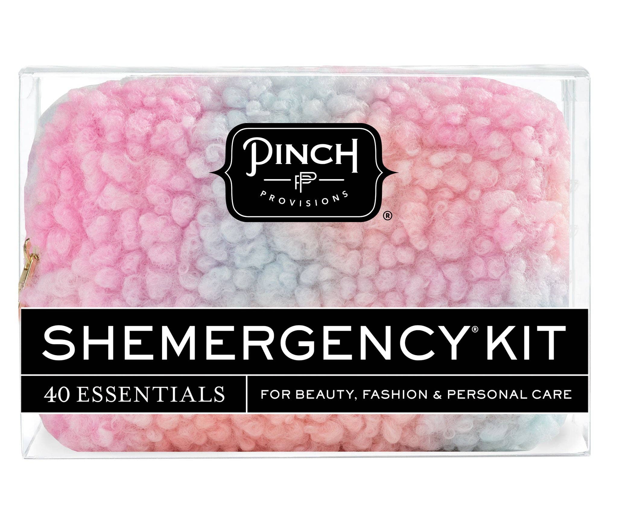 What looks like cotton candy on the outside, but is a lifesaver on the inside? It's the new Sherpa Multi Shemergency Kit by Pinch Provisions. With hints of pink, peach, lavender, and minty blue, the dreamy sherpa pouch makes the perfect transition from winter to spring.