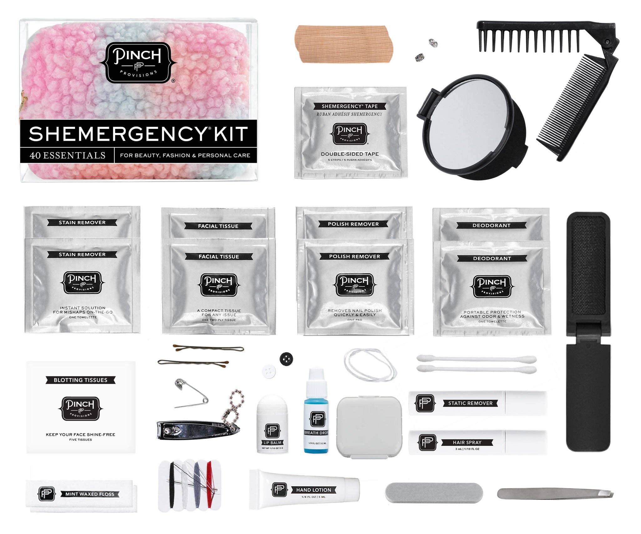The Shemergency Kit's 40 must-haves include: Hair spray, folding hair brush/comb, 2 clear elastics, 2 bobby pins, 2 earring backs, hand lotion, nail clipper, emery board, pill container, 2 nail polish remover pads, mending kit, safety pin, 5 double-sided tape strips, lint remover, 2 stain removing towelettes, static remover, breath freshener, lip balm, 2 single-use dental floss, 2 deodorant towelettes, extra buttons, 2 adhesive bandages, 2 facial tissues, blotting tissues, compact mirror, tweezers, and cotton swabs.