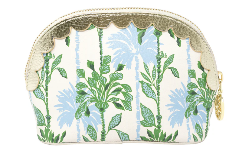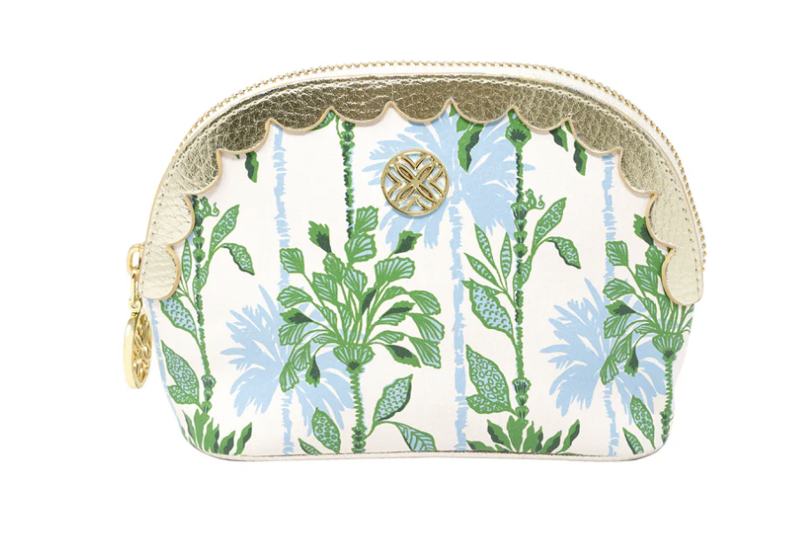 Add a splash of seaside charm to your everyday essentials with this small pouch in the Swayin in the Breeze pattern. Featuring a beautifully textured leatherette exterior and a smooth polyester interior, this petite pouch is as practical as it is polished. The flat base gives it structure for easy standing, while the delicate scallop trim adds a touch of breezy elegance. Finished with a gold zipper closure and a signature logo zipper pull, it’s perfect for stashing makeup, travel essentials, or small treasures on the go.