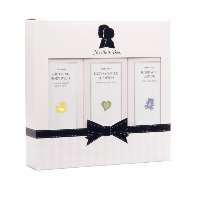 - Set includes 8 ounces of Extra Gentle Shampoo, Soothing Body Wash, and Super Soft Lotion.
