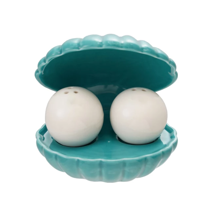 Stoneware Salt & Pepper Shakers with Shell Shaped Holder