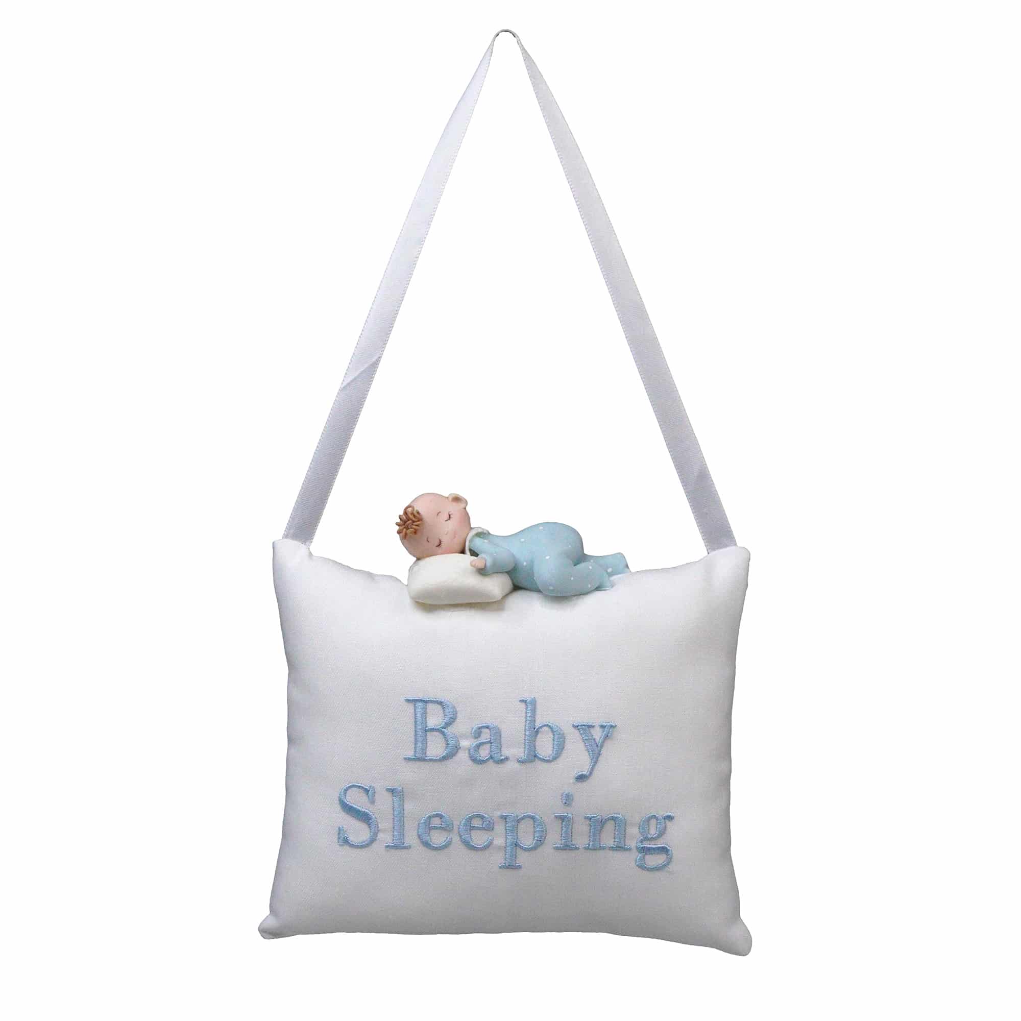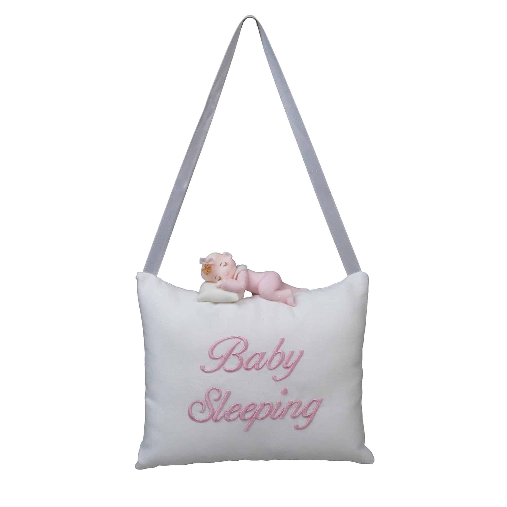 This adorable hanging pillow sign is the perfect way to let everyone know that your baby is sleeping. The soft, white pillow is embroidered with the sweet saying “Baby Sleeping” and features a cute little sleeping baby sitting on top. It measures approximately 6″ x 5″ and when hung, it is approximately 11″ long.