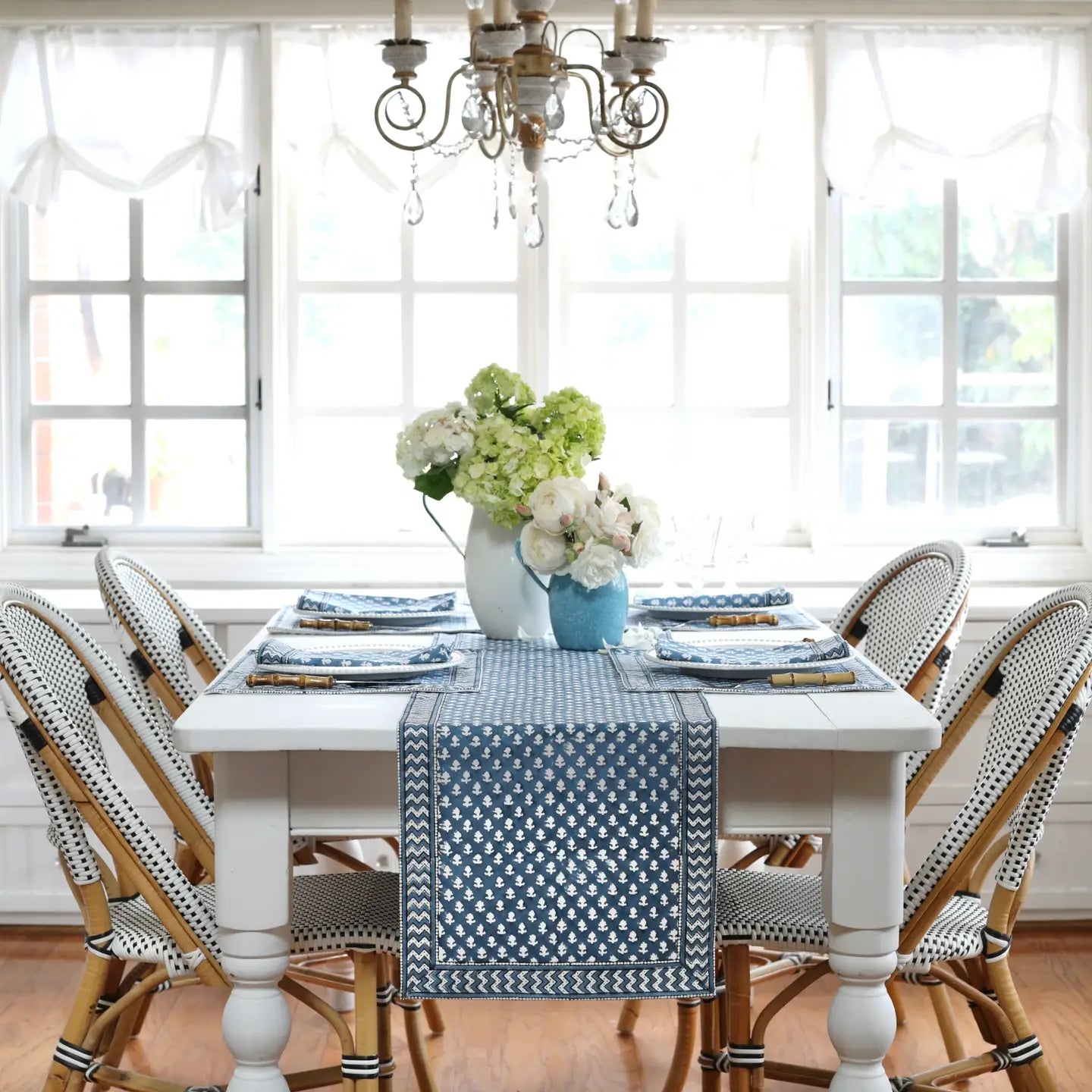 A table runner is a versatile textile. Use one on your table, along a buffet, or over a dresser – wherever you want a pop of color and pattern. Hand block-printed at out fair-trade workshop in Jaipur, India on 100% cotton canvas, 14″x92″. Machine wash, line dry, warm iron.