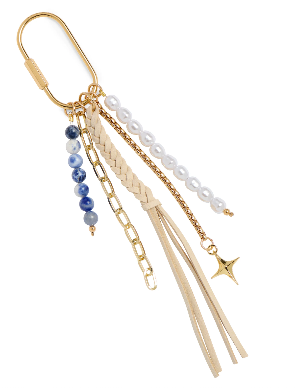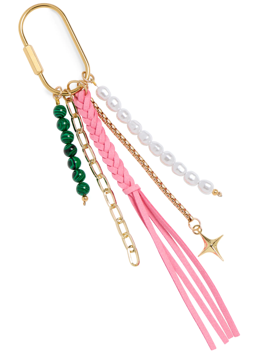 Add a playful twist to your everyday tote with our Tassel Bag Charm/Key Ring. This eclectic accent features a mix of textures, including faux suede fringe, glossy pearls, stone beads, and polished gold-tone chains. The oversized clasp makes it easy to clip onto your favorite bag or keychain for instant flair. Available in a variety of colors, it’s the perfect finishing touch for personalizing your accessories.